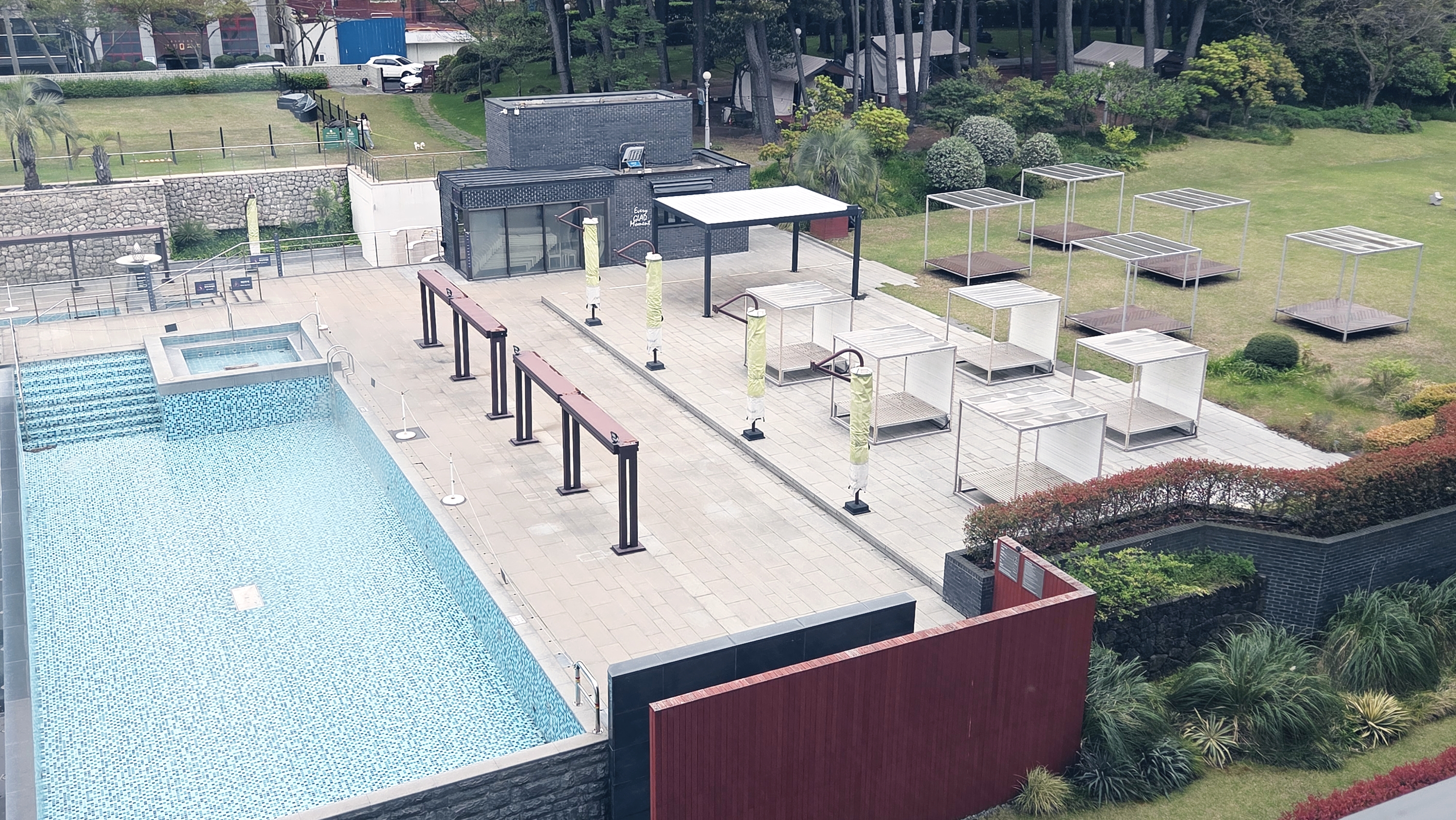 수영장 (더 파티오 풀)은 인피니티 풀과 패밀리 풀, 자쿠지로 구성되어 있으며 야외에서 제주의 햇살을 즐기며 수영을 즐길 수 있습니다. 수영장 이용 요금은 성인 30,000원, 소인 20,000원이며 투숙객 할인이 월별로 상이하게 적용됩니다. 4월 방문 기준으로는 수영장 시즌 오픈 전후일 수 있으니 방문 전 확인이 필요합니다.