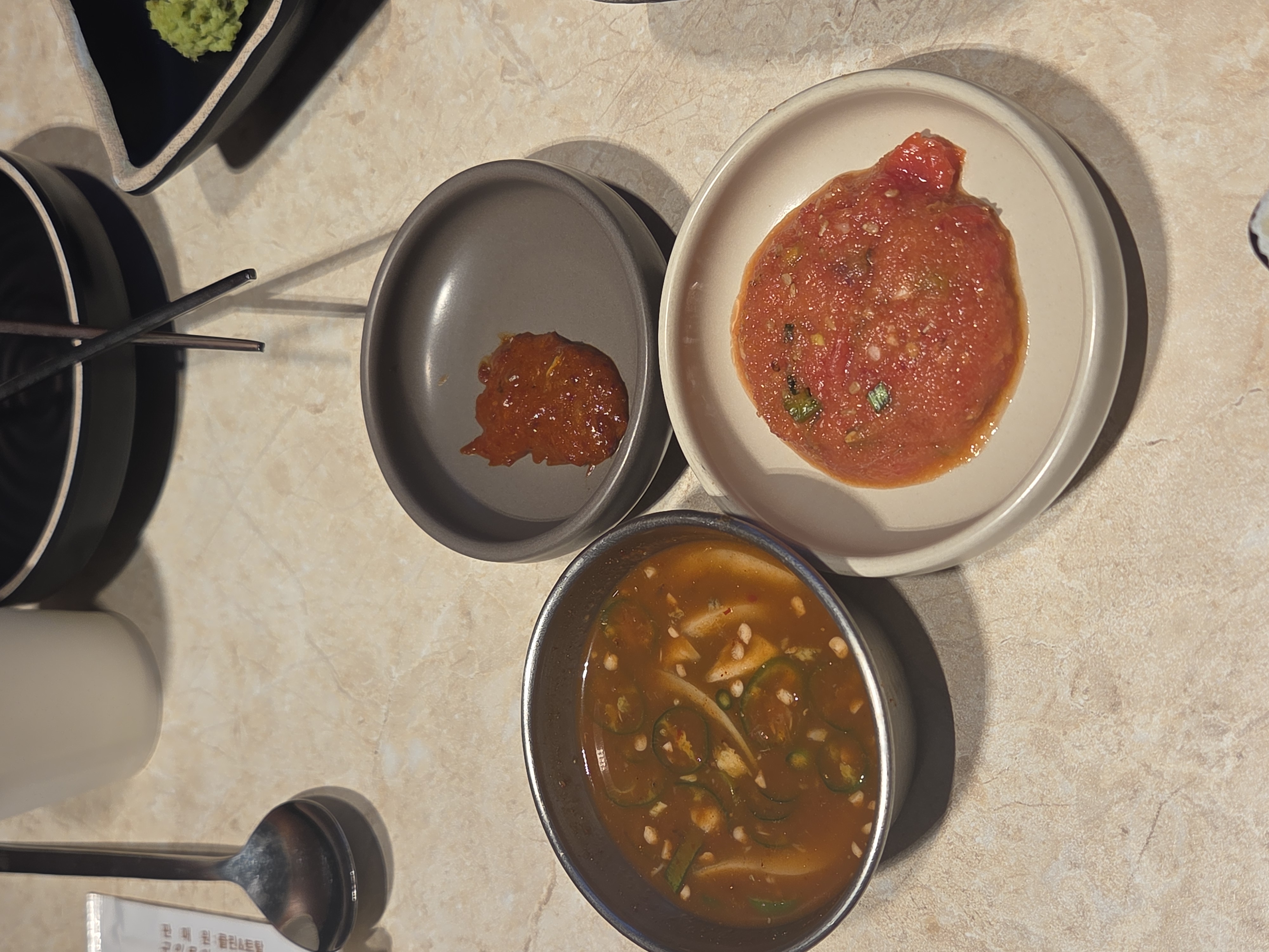 갈치속젓 솥밥, 열무국수 등 제주 향토 재료를 활용한 사이드 메뉴도 준비되어 있으며, 고기와 함께 즐기는 명란젓·멜젓·와사비·표고소금 등 다양한 소스류와 명이나물·깻잎·고사리 절임이 기본 제공됩니다. 서비스로 나오는 김치찌개는 고기가 넉넉히 들어있어 전문점에서 따로 주문해도 손색이 없을 수준입니다.